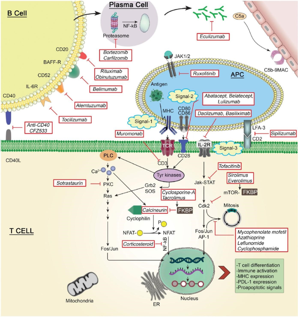 Awareness of immunosuppressive agents’ immunological reaction to solid organ transplantation tolerance is essential . The adaptive immune response to the donor grafting starts with identifying alloantigen by a pure T cell. And then, the T cell starts to proliferate and to differentiate . This main event’s frequency depends on the association between the T cell receptor (TCR) and the antigen provided as peptide by the APC and the receptor/ligand interaction. The active T cells have cytotoxic effects. It can interact with the B cell for antibody production and cause hypersensitivity to the macrophages . The three-signal T cell activation and proliferation model offer details on the molecular mechanism and domain of immunosuppressive drugs .