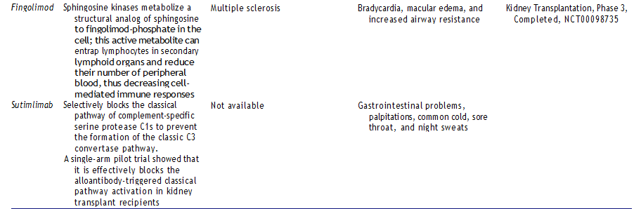 In another study, gastrointestinal and cardiac adverse events are higher in the group receiving sotrastaurin. It has also been shown that concomitant administration of sotrastaurin with everolimus causes more failure than cyclosporine-A and only improves kidney allograft function. Also, in vitro studies have shown that it can cause QT prolongation, and, therefore, another study has been conducted on healthy volunteers. According to the study, therapeutic doses have not been confirmed to cause QT prolongation. A reversible increase in average ventricular heart rate was observed in a single dose of 500 mg, and average heart rates remained within the normal range. New immunosuppressive agents, mechanism of action, indications, side effects, and clinical trials are summarized in Table 1.