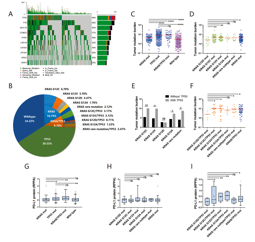 Figure 1A shows a heatmap depicting the frequency of main genetic alterations in 567 LUAD samples from TCGA database. Figure 1B shows the frequency of KRAS and TP53 mutation in 567 LUAD samples from TCGA database. Figures 1C, 1D, 1E and 1F show different tumor mutation burden driving by specific gene mutation status based on TCGA database. Figures 1G, 1H and 1I show correlation between KRAS and TP53 mutation status and immune checkpoints PD-L1 expression based on TCGA database. Data represent mean plus or minus standard deviation. LUAD stands for lung adenocarcinoma. TCGA stands for The Cancer Genome Atlas. Mut stands for mutation. NS means no significant. Single asterisk indicates p less than 0.05. Double asterisk indicates p less than 0.01. Triple asterisk indicates p less than 0.001. Quadruple asterisk indicates p less than 0.0001. Statistical analysis used Mann-Whitney U test.